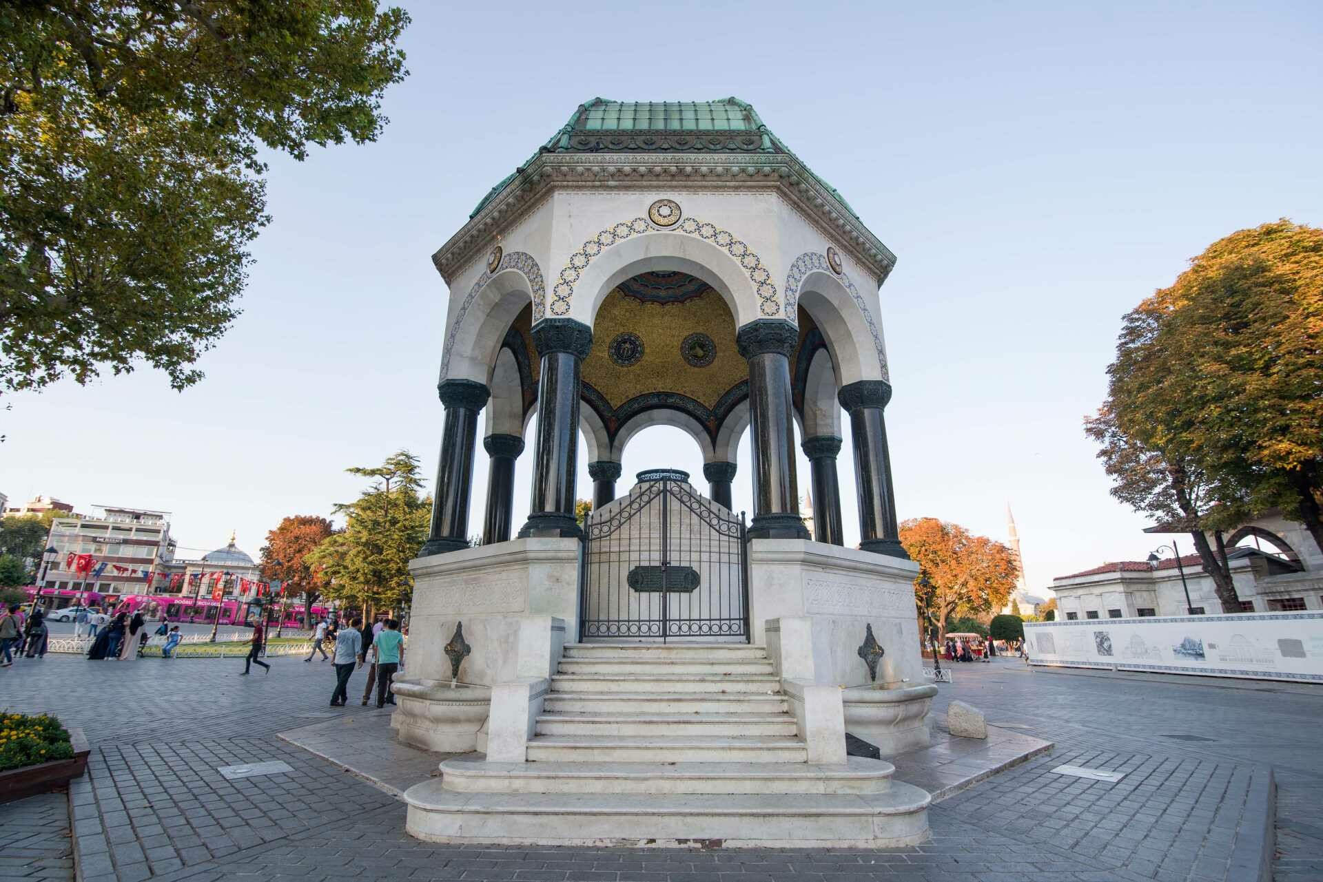 Once the social and sporting center of Byzantine Constantinople, the Hippodrome was later a ceremonial space in the Ottoman era. Today, it features several historic monuments including the Obelisk of Theodosius, the Serpentine Column, and the German Fountain.
